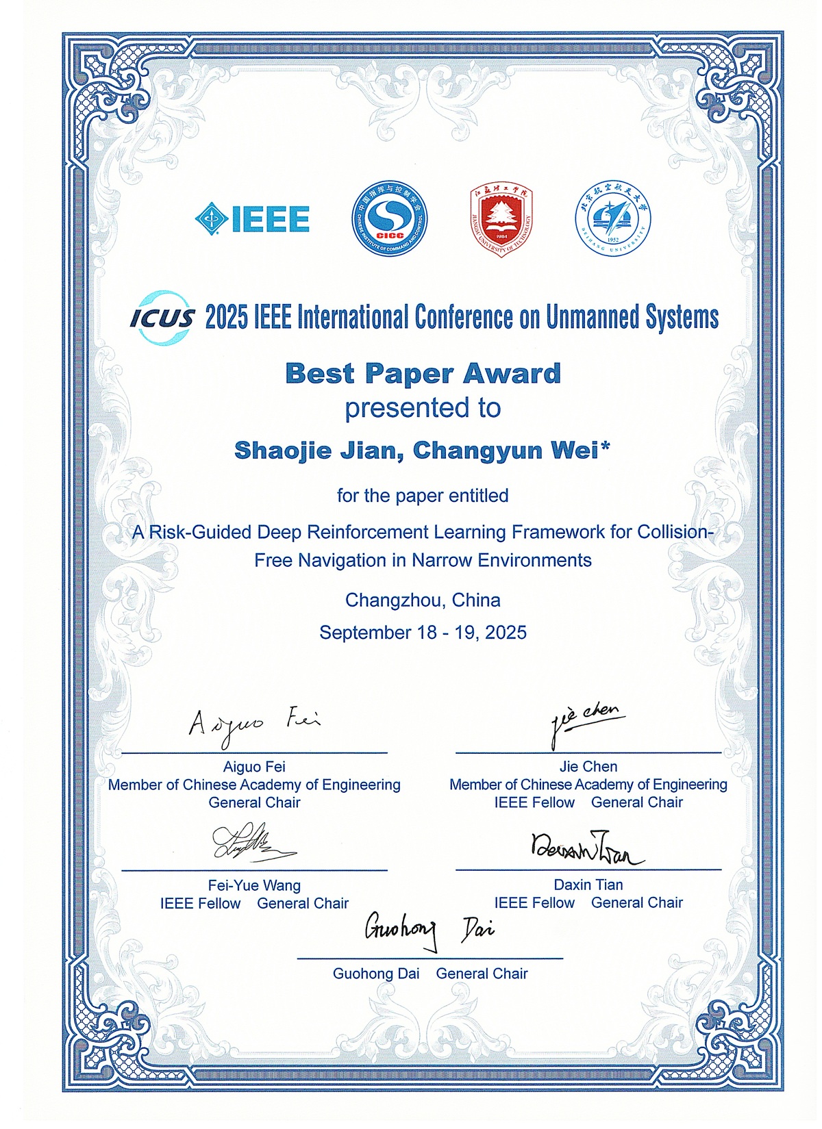 2025年9月18-19日,由中国指挥与控制学会、IEEE 南京分会主办,中国指挥与控制学会无人系统专业委员会承办的 2025 第八届 IEEE 国际无人系统大会(ICUS 2025)在江苏常州召开。伟德betvlctor1946源于英国硕士研究生简少杰(导师:魏长赟教授)以第一作者身份发表的论文,荣获大会最佳论文奖,论文题目为《A Risk-Guided Deep Reinforcement Learning Framework for Collision-Free Navigation in Narrow Environments》。