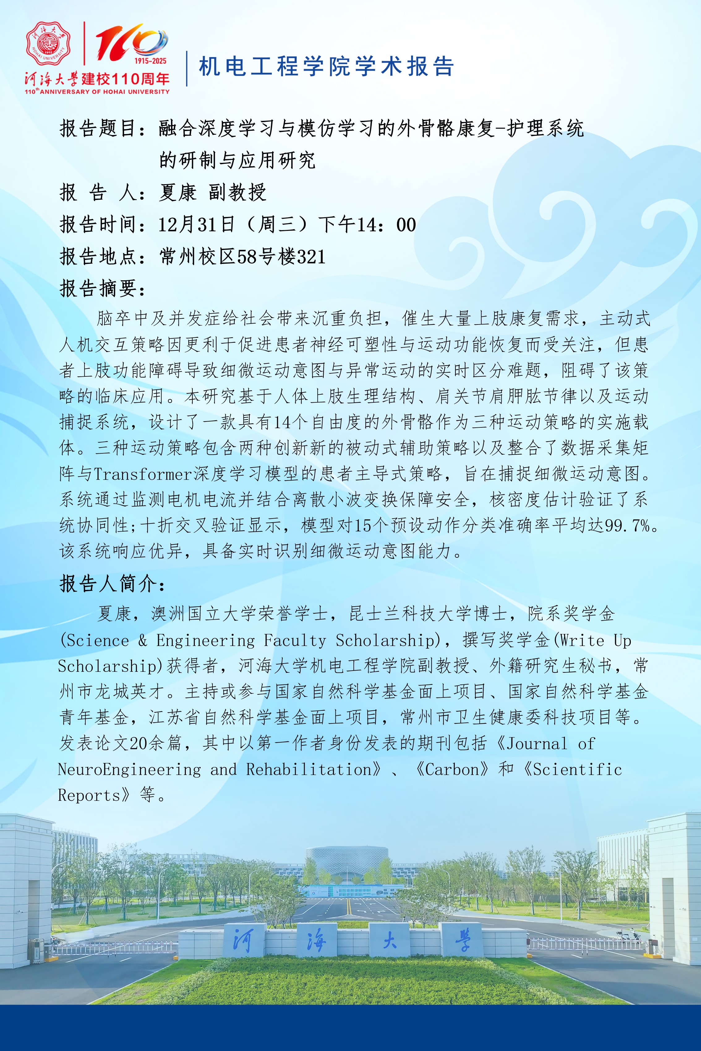 学术报告:融合深度学习与模仿学习的外骨骼康复-护理系统的研制与应用研究