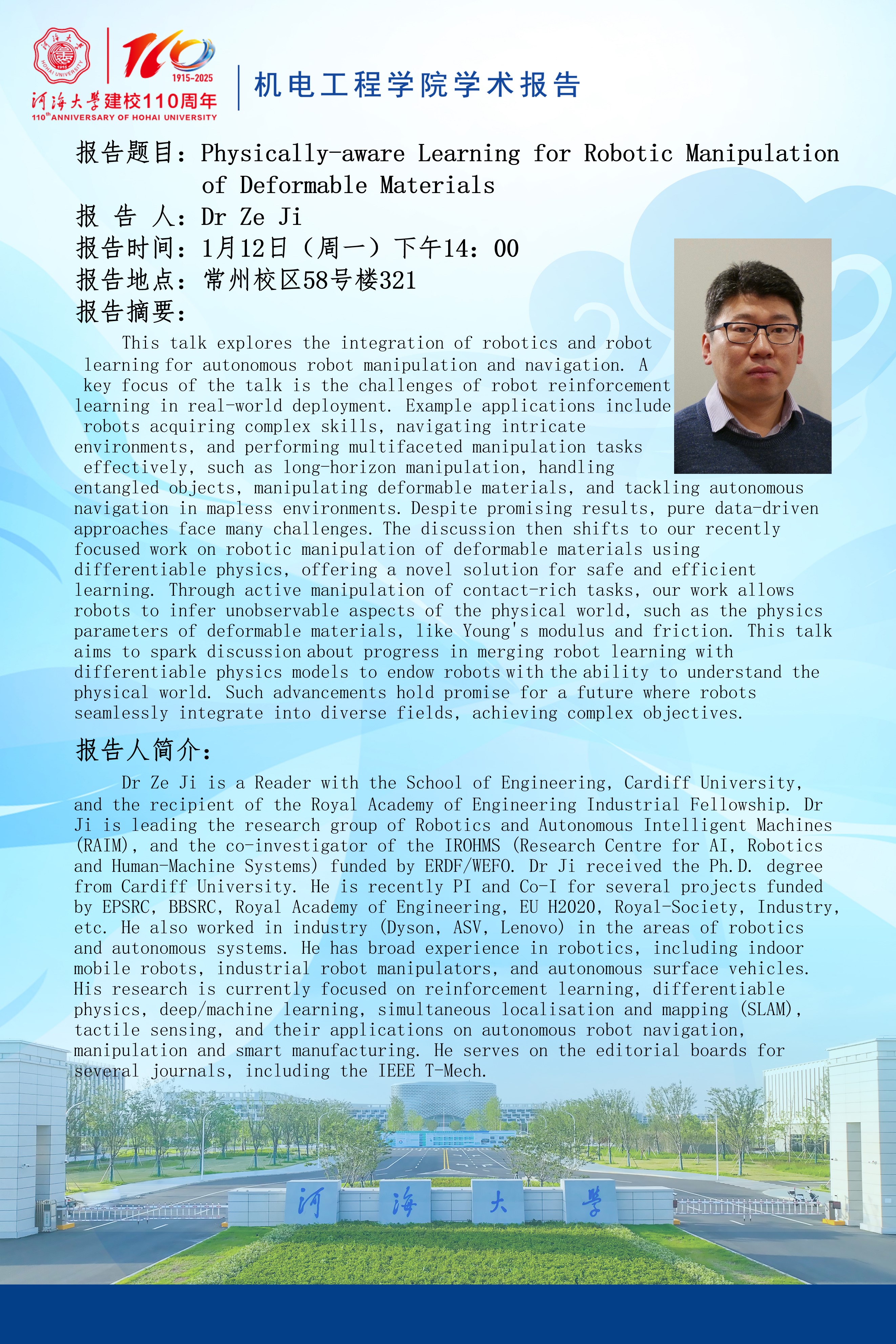 学术报告:Physically-aware Learning for Robotic Manipulation of Deformable Materials